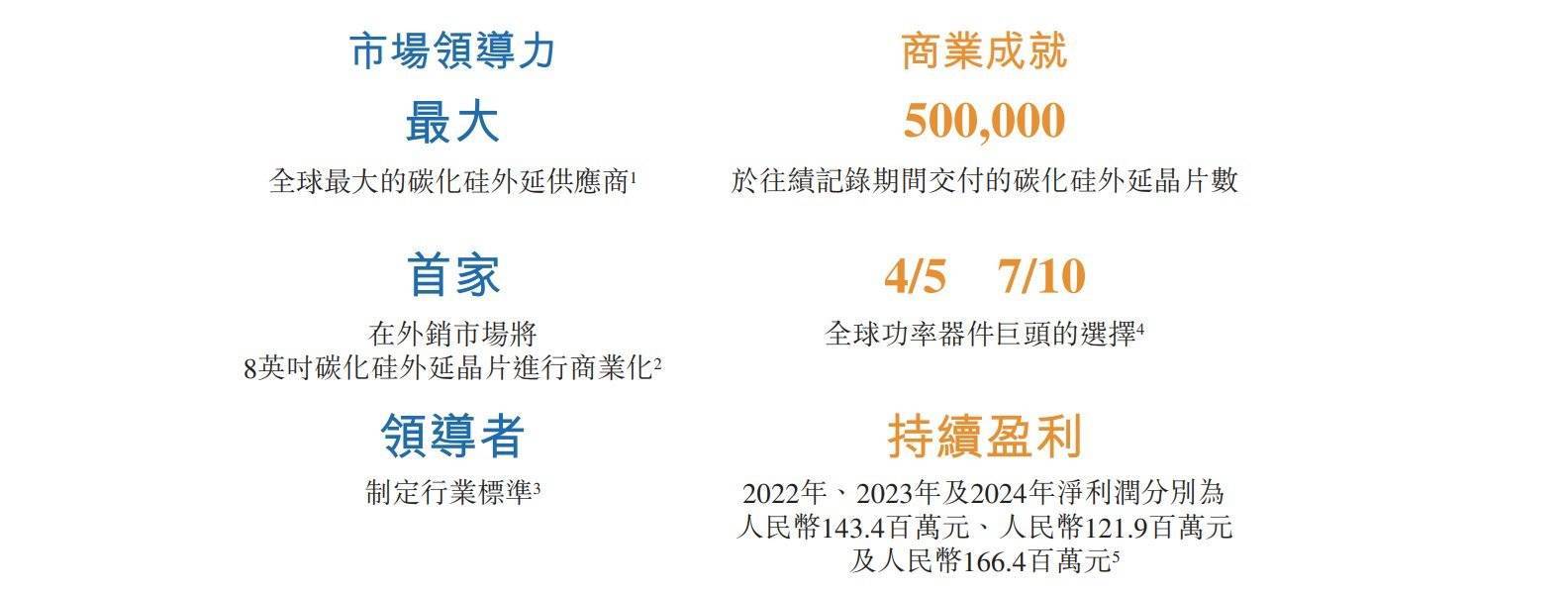 瀚天天成牵头撰写并制定了全球首个及目前唯一的碳化硅外延国际半导体设备与材料产业协会(SEMI)行业标准。于2024年,瀚天天成通过外延片销售和代工模式累计销售了超过164,000片碳化硅外延芯片;于往绩记录期间,该公司累计交付了合共超过500,000片碳化硅外延芯片。